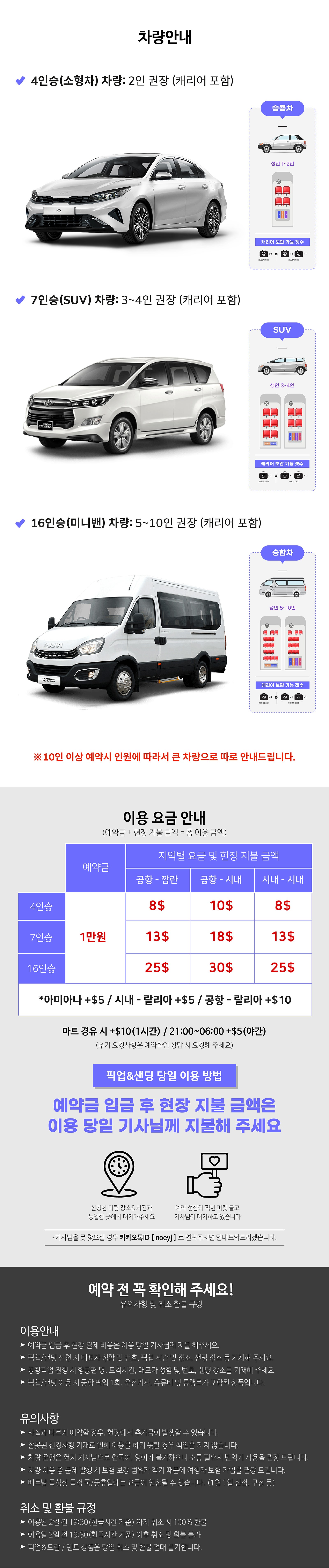 *사이트 예약 방법 안내 1. 인원에 맞춰 차량 결제 2. 카카오톡 상담 채널로 예약 확인 카톡 남기기 3. 담당자 확인 후 예약 확인서 전달 4. 차량 이용 전날 예약 확정서 전달, 차량 일정 종료 후 기사님께 현장지불 완료. -상담 시간 안내 [영업시간] - 한국시간 기준 입니다. 월 ~ 토 10:30 ~ 19:30 일요일 및 공휴일 휴무 점심시간 14:00~15:00 * 토요일은 예약이 어려울 수 있습니다. [현지비상연락망] 카카오톡 아이디 : noeyj * 비상 연락을 제외한 문의는 받지 않습니다.