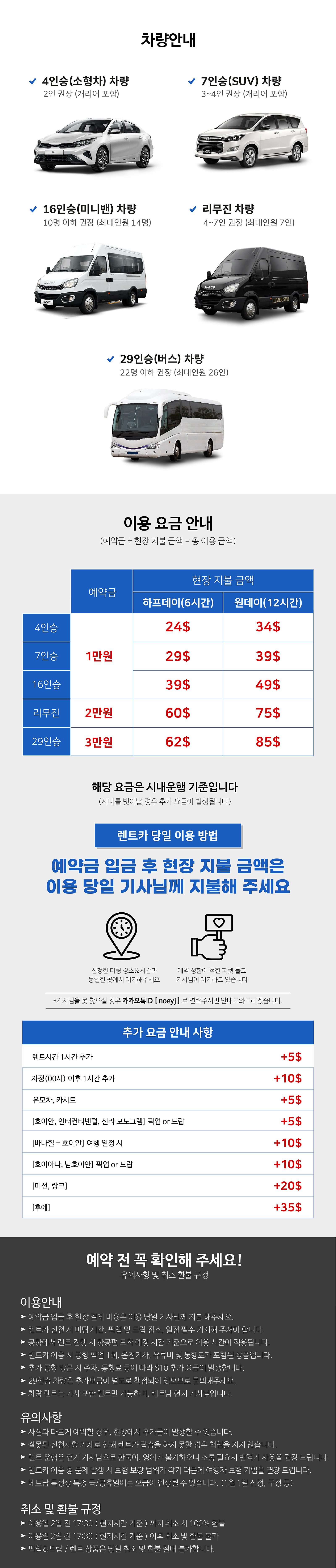 *사이트 예약 방법 안내 1. 인원에 맞춰 차량 결제 2. 카카오톡 상담 채널로 예약 확인 카톡 남기기 3. 담당자 확인 후 예약 확인서 전달 4. 차량 이용 전날 예약 확정서 전달, 차량 일정 종료 후 기사님께 현장지불 완료. -상담 시간 안내 [영업시간] - 한국시간 기준 입니다. 월 ~ 토 10:30 ~ 19:30 일요일 및 공휴일 휴무 점심시간 14:00~15:00 * 토요일은 예약이 어려울 수 있습니다. [현지비상연락망] 카카오톡 아이디 : noeyj * 비상 연락을 제외한 문의는 받지 않습니다.